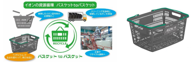 店内用買物かごは、使用できなくなった買物かごをリサイクル素材として配合した「バスケット to バスケット」を、イオン東北として初導入する。