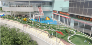 JR伊丹駅直結のペデストリアンデッキで展開している2階の「テラスパーク」には、小さい子どもが楽しめる遊具を設置する。