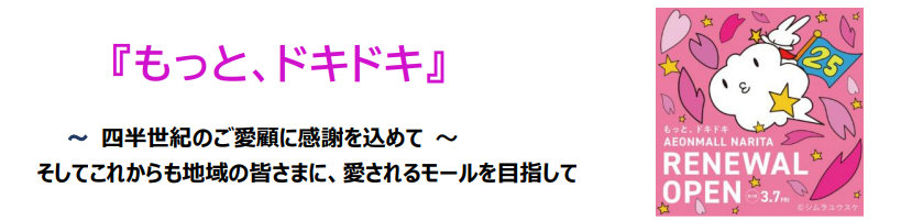 日本の玄関都市「成田」を代表する商業施設として2000年3月に誕生した「イオンモール成田」は、今春で25周年を迎える。地域だけでなく来店する全ての顧客に愛されるモールを目指して、リニューアルする。