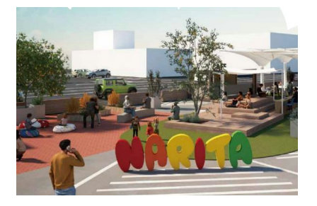 これまで「第4駐車場」として利用していた平面駐車場の一部を活用して約1000㎡の屋外ひろば「ナリタテラス」を4月下旬に新設する。中央の芝生広場には、巨大パラソルとウッドデッキを設け、憩いの空間を創出。土・日にはイベントやワークショップなどを開催する。