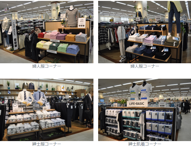 昨年秋に誕生したライフのオリジナル衣料品ブランド「LIFE BASIC(ライフベーシック)」の魅力をよりアピールするために、各売場で新しい商品棚を用いて集合展開している。
