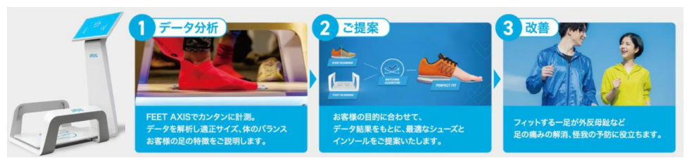 また同店では、次世代足型測定サービス「FEET AXIS(フィートアクシス)」を設置する。顧客の足型を3D計測器で測定・分析したデータからマッチするシューズ情報をもとに、顧客に合うシューズを提案する。