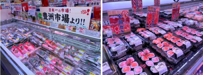 鮮魚部門では、豊洲市場で直接買い付ける豊富な魚種を取り揃え、「生鮮市場TOP!」ならではの大容量と圧倒的な品揃えを行う。季節魚の巻き寿司「具たっぷり海鮮太巻き」 を新商品として導入する。