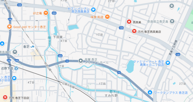 同店はJR和歌山線「香芝駅」から東に1kmほどに位置する。香芝駅の西側には「万代 香芝下田店」がある。