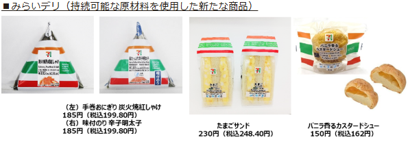 「商品」では、持続可能な原材料を使用したオリジナルフレッシュフードや、環境配慮型のパッケージで包装された商品などに取り組む。商品の原材料では、“生態系に悪影響与えないこと”“乱獲しないこと”をルールとした持続可能な漁業により漁獲されているアラスカの天然水産物である「アラスカシーフード」に、発芽黄エンドウ豆から製造したプラントベース(植物由来)を配合した「手巻おにぎり 炭火焼紅しゃけ」や、発芽大豆から製造したプラントベース(植物由来)「さながらエッグ」を使用した「たまごサンド」や「バニラ香るカスタードシュー」を販売する。