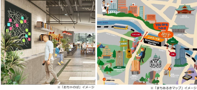 コミュニティスペース「おちゃのば」を設けた。約8種類の御茶ノ水近隣でつくられたフリーペーパーを設置する。