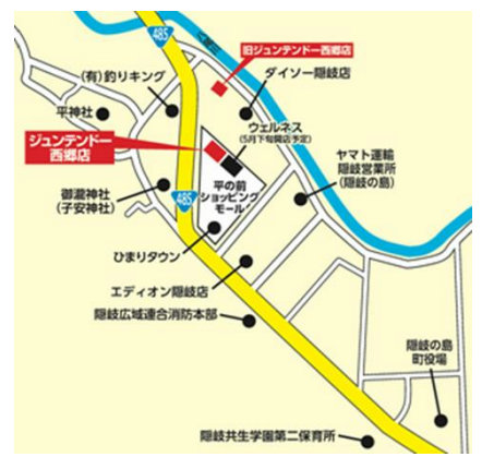 西郷店は、隠岐の島町中心部を通る国道485号線沿いに位置し、旧西郷店から約200mの距離にあるショッピングモール「ひまりタウン」内に立地する。