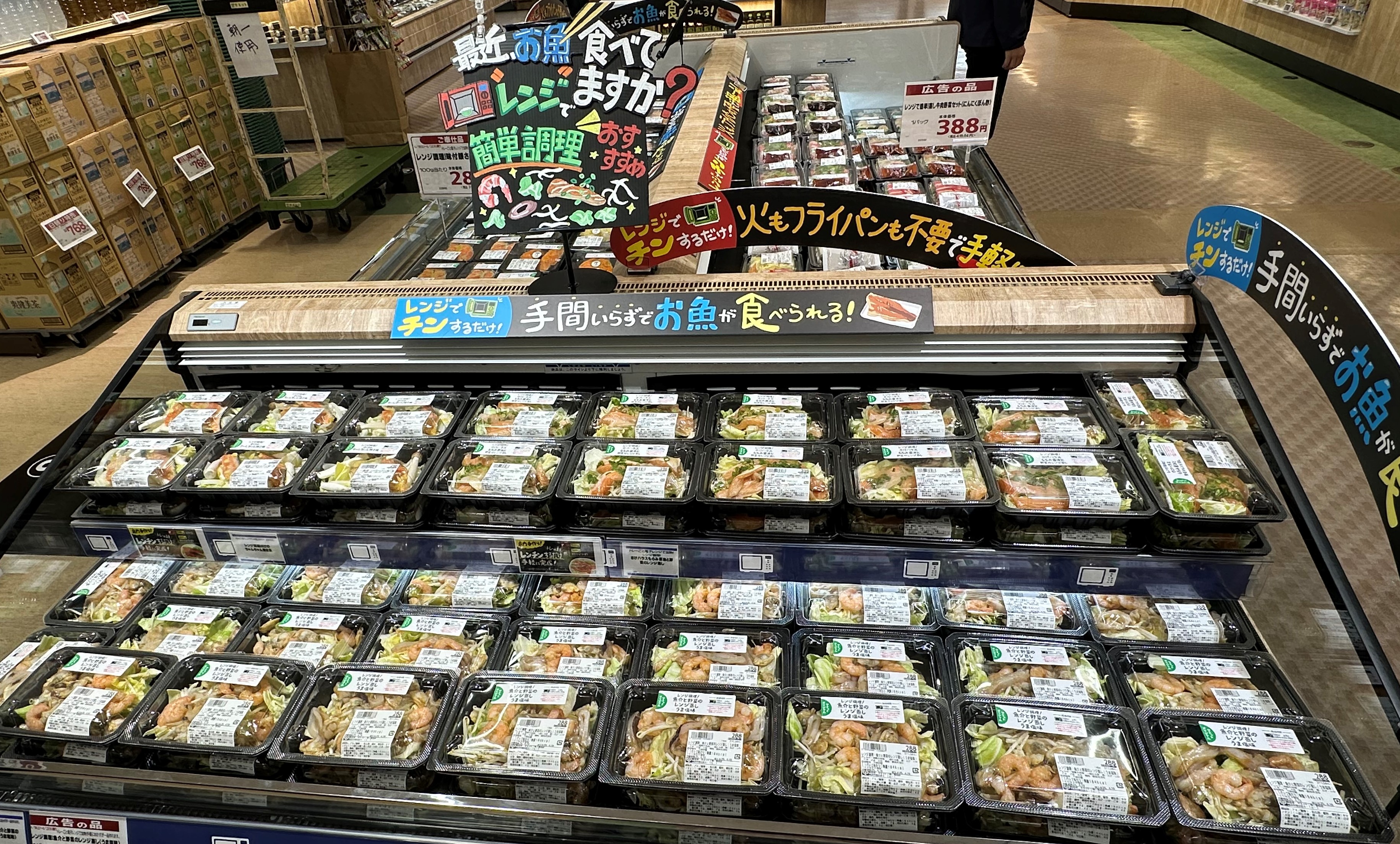 精肉・鮮魚の素材を使ったレンジアップ商品は、総菜売場で展開する。