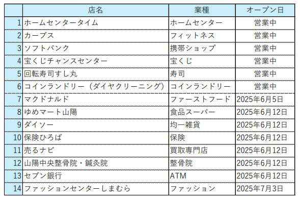 ゆめモール山陽は、スーパーマーケットの「ゆめマート山陽」を中心に、ホームセンターの「タイム」、ファッションセンターしまむら、ダイソーなどの専門店、レストランなどを一ヵ所に集約したオープンモール形式の「近隣型ショッピングセンター」となる。