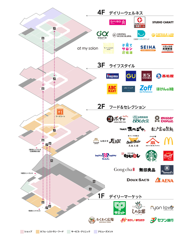 1階はデイリーマーケットのゾーンで、核店舗として足立区最大級となるサミットストアと専門店が入る。2階はフード&セレクションゾーン。約500席の座席数と飲食店10店舗を揃えた、綾瀬エリア初の大型フードコートと無印良品、ドラッグストアのトモズなどで構成する。3階はライフスタイルゾーンで、ノジマ、GU、西松屋、ABCマート、Zoffなどデイリーユースの専門店を集積。そして4階はダイソー、医療モール、英語教室など。