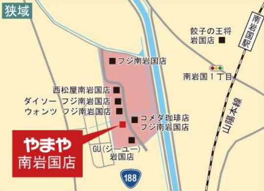 「やまや南岩国店」はJR山陽本線の「南岩国駅」から南西へ約 800m、車では国道188号線沿い、「南岩国一丁目」交差点から南へ約260mの距離に位置する。
