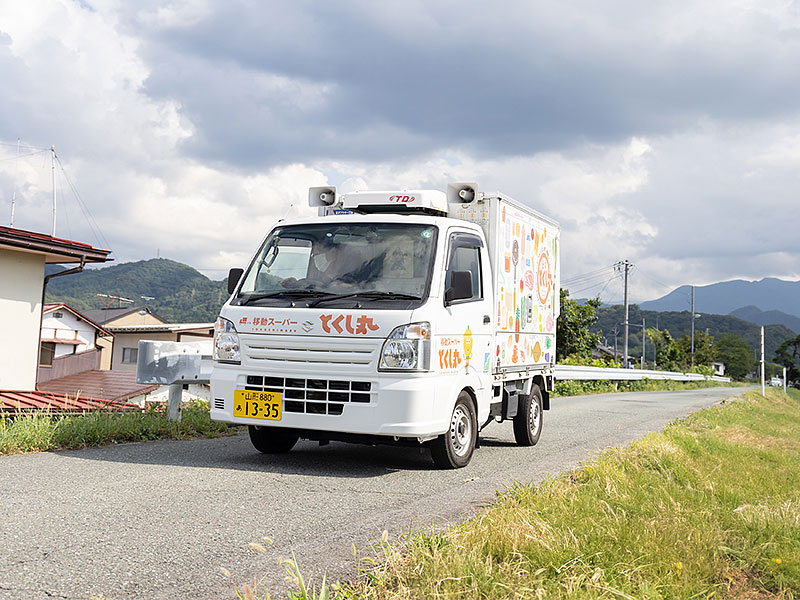 移動スーパー「とくし丸」は、日常の買物が困難なお客の玄関先へ専用車両で訪問し、ドライバーと会話をしながら買物をしてもらうサービス。