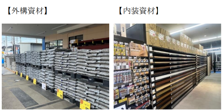 セメント・砂・砂利・ブロックなど外構資材のボリューム展開し、リフォーム需要に対応できるよう内装建材も充実させる。