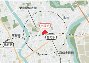 「東金町一丁目西地区市街地再開発事業」は、JR「金町」駅北口の西側に位置する約3.0haのエリアの開発事業だ。地域の回遊性を促進するため、広場や歩道状空地の整備による歩行者ネットワークを形成し、魅力ある都市環境の創出を図る。