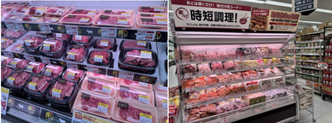 精肉部門ではオリジナルブランド牛「武蔵黒牛」を品揃えし、時短調理の味付け肉シリーズをバラエティ豊富に展開する。