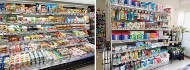 店内では、飲料や酒、日配品、日用品といった商品をはじめ、店内製造の惣菜や、旬の野菜・果物を品揃えする。