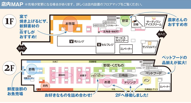 2階の生鮮売場は、「東京野菜」を扱った「農家さんのおすすめ市」や「手紙のついた野菜と果物」と名付けた冷凍青果を揃える。