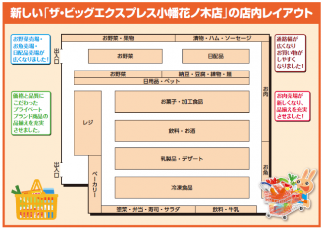 同店は改装によって、野菜、魚、日配品売場を拡張する。通路幅も広くし、買物利便性を向上させる。また商品面では、肉売場で品揃えを充実させる。プライベートブランド商品の品揃えも増やす。