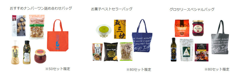 イオンモール伊丹店のオープン限定企画として、商品を詰め合わせたオリジナルのバッグ「おすすめナンバーワン詰め合わせバッグ」4860円(税込 以下同)、「お菓子ベストセラーバッグ」3240円、「グロサリースペシャルバッグ」3240円の3種類を販売する。
