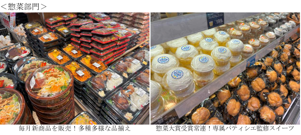 また、惣菜コーナーは「お弁当・お惣菜大賞」などの外部機関で受賞した商品に加えて自社工場で開発した多種多様な商品、できたて作り立ての商品を揃える。