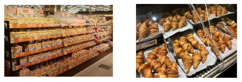 パンコーナーとベーカリーコーナーは、買い物しやすいように集合展開する。店内で一つずつ焼き上げるクロワッサンや石窯ピザなどを取り扱う。