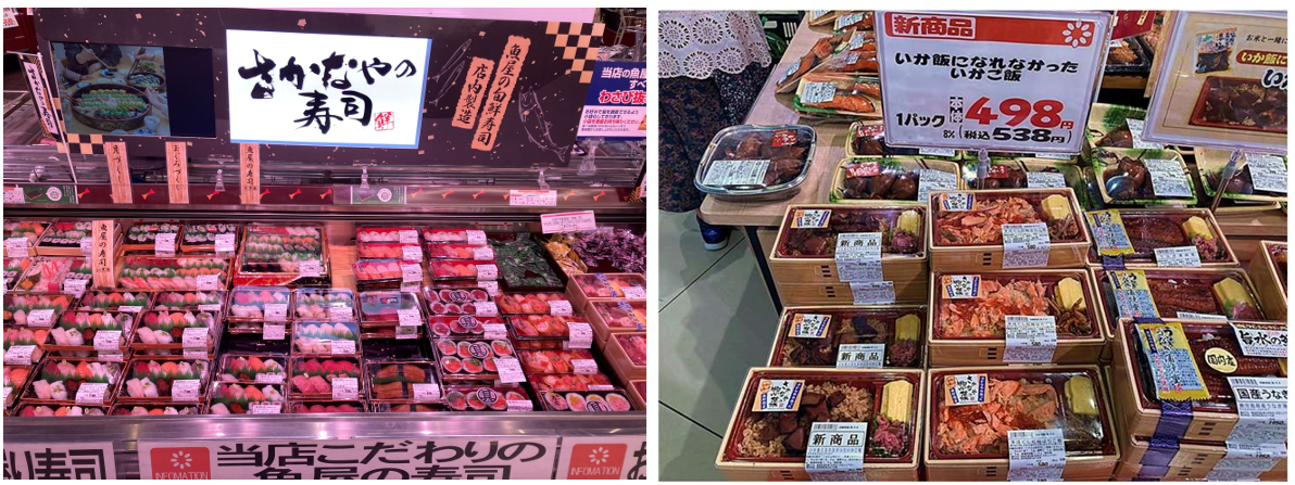 (2)鮮魚を使用した「さかなやの寿司」「さかなやの惣菜」コーナーや、デリカ鉄板焼き商品の品揃えを充実。お好み焼きや焼きそばに加えて、あんかけ焼きそばなどの「手づくり」「でき立て」にこだわった鉄板焼商品などは、道南ラルズ最大の品揃え。