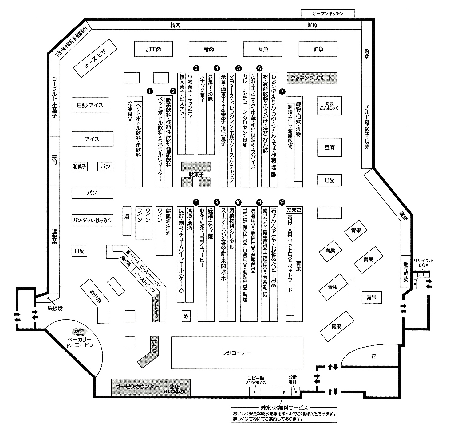 この店は惣菜売場が特徴。孤を描くように設けられた売場は通路幅も広い。あまりの混雑で取材は後日対応となったため、売場写真はないが、店舗レイアウトは以下の通り。