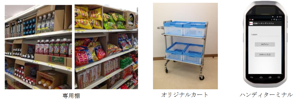 具体的には、高頻度注文商品(常温・チルド商品)は、2階の専用棚でストック。生鮮食品、冷凍食品、中・低頻度商品は、1階の実店舗に品ぞろえされた商品からピッキングする。ピッキングは4件分の注文を同時に行えるオリジナルカートを使用する。また、同店仕様のハンディターミナルは、一度に4件分の注文品を、最短の距離でピッキングできる順番を表示する。これらによって受注・配送能力は通常の3〜4倍に拡大される。