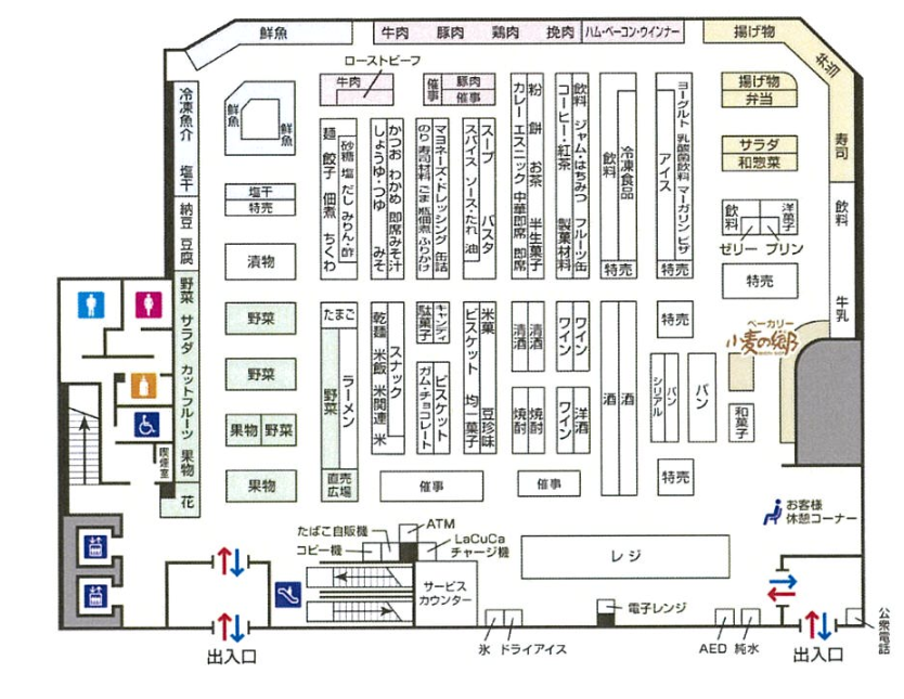 右翼は惣菜からインストアベーカリー「小麦の郷」を配置。惣菜ではグリルメニューをメインにした「バイキングコーナー」、少量、大量目を揃える弁当・寿司類を強化。