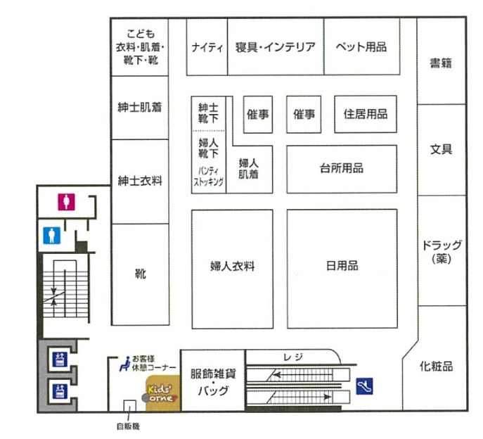 2階は普段の暮しのために必要な衣料や生活用品が揃う。1階のお客様休憩コーナーだけでなく、2階にも休憩スペースを設置している。