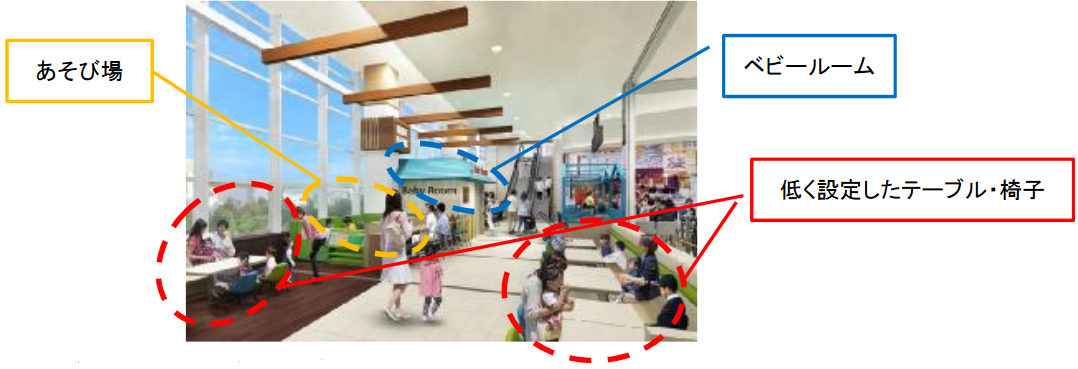 フードコートは環境を全面リニューアル。テーブルや椅子などを一新するほか、家族で利用できる「キッズパーク」を新設。パーク内には約100席を備え、あそび場を併設したベビールーム(授乳室)を用意した。