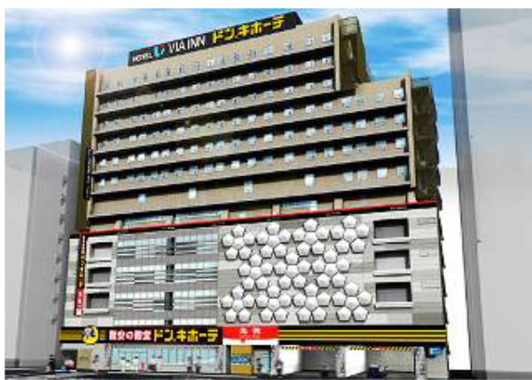 「ドン・キホーテあべの天王寺駅前店」の外観イメージ。上層階はホテル。