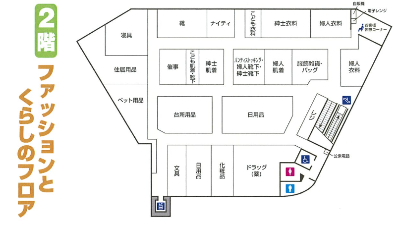 建物は鉄骨地上2階建ての2層で、1階が食品、2階には日用品と衣料品を揃える。