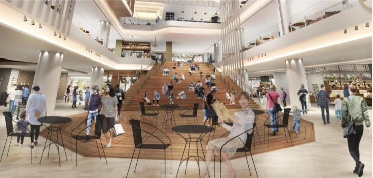 「プライムツリー赤池」が目指すのは、その名のとおり「プライム=極上」で、ショッピングモールの五つ星。こだわりの外観デザインや内装を施し、吹き抜け空間は、時間帯に合わせた照明の調光で演出する。また施設のシンボルとなる大階段を設け、コミュニティーの場として演奏会などのイベントを開催する。