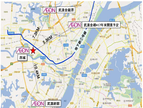 「イオン西城店」は、商業の中心である漢口エリア西部に位置する。店舗周辺では、副都心として住宅開発を含めた大規模再開発が進んでいる。