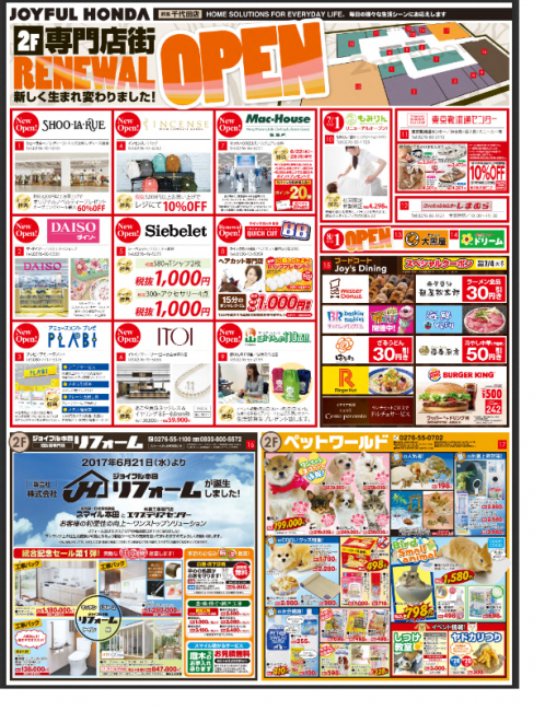 (株)ジョイフル本田(茨城県土浦市、矢口幸夫社長)は、6月21日(水)、千代田店(群馬県邑楽郡)2階の専門店街をリニューアルオープンする。