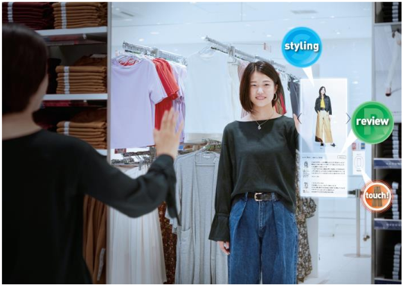 RFIDセンサーが付いたオシャレナビ・ミラーでは、商品をかざすと、その商品を着用したモデルや最大1000種類の一般人のコーディネートスタイル、購入した顧客の商品レビューを見ることができる。