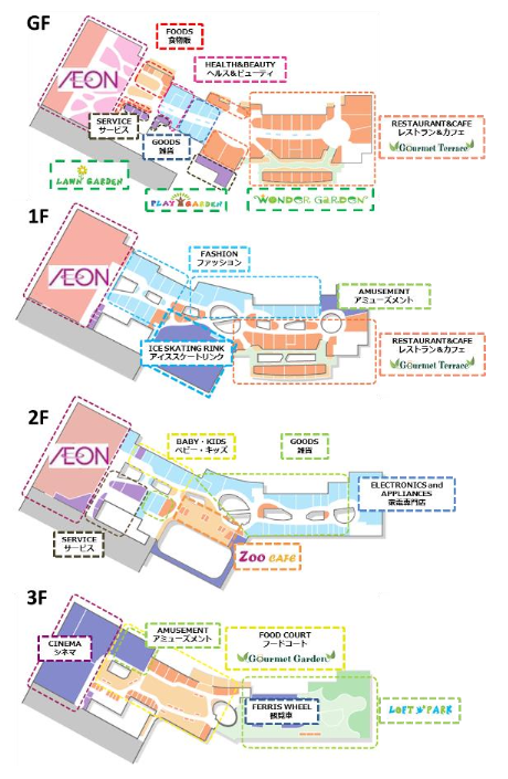 店舗数/核店舗:イオンJGC店(総合スーパー)サブ核店舗:CGV CINEMA(シネマ)、FANPEKKA(キッズアミューズメント)、BESTDENKI(家電量販店)、FanWorld(ゲームセンター)、専門店数:227店舗