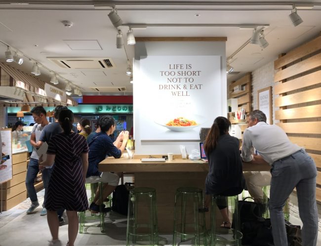 駅構内だが、改札の外という限られたスペース140坪ほどに、ちょっとイータリーらしい迷路のような動線を設けて、イタリアの食材とフードスペースを設けた[グランスタ丸の内店]。東京駅の丸の内側改札口から1分の立地。一度は視察しておきたい。