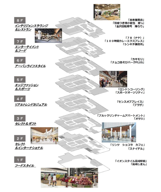 商業施設の敷地面積は約7400㎡(約2240坪)。建物構造は地上8階建てで、1階に「イオンスタイル高崎駅前」を核店舗として配置し、2階~5階の4フロアはファッション、6階はアーバンライフスタイルを提案する家具や文具などの専門店を揃え、7~8階はエンターテインメントと飲食店のゾーンの構成。