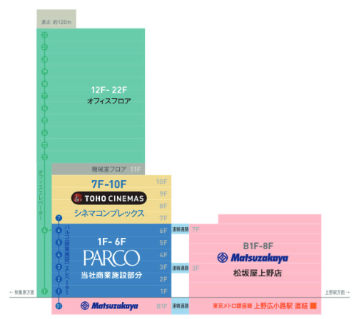 地下1階に「松坂屋上野店」、1階から6階に「パルコ」、7階から10階に「TOHO シネマズ」が入る。高層部の12階から22階はオフィス。建物の高さは117mで、上野の新たなランドマークを目指す。