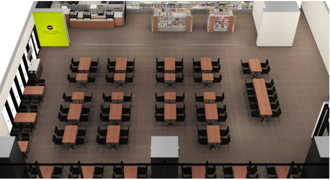 本店舗にはカウンタータイプ6席、10人掛けテーブル1席の16席を用意。また5階のサテライト店舗は2人掛けテーブル席55席の110席で、ファミマでは最大規模の席数となる。営業時間は、7:00~13:30までの限定だが、朝食やランチタイム需要に対応する。