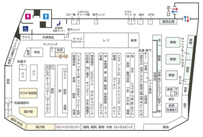 店舗は2階建て。1階が売場で、面積は849㎡(257坪)と小型のスーパーマーケット。駐車場は設けていない。