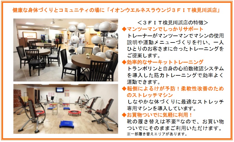イオンウエルネスラウンジ3FITは、イオンが運営するスポーツジムで、千葉市で初出店、全国3店舗目となる。シニア層をターゲットに、ストレッチ重視のマシンやプログラムを用意する。コミュニティを重視したラウンジスペースも設ける。