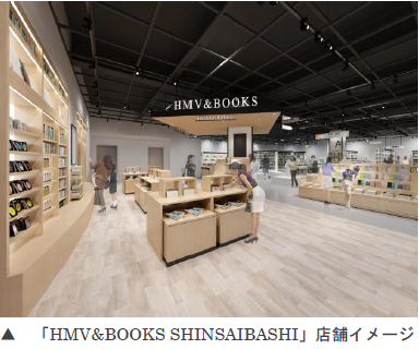 「HMV&BOOKS SHINSAIBASHI」は、大阪・心斎橋の商業施設「心斎橋オーパ」8F に出店する。書籍を中心に、音楽、映像ソフト、雑貨、チケットなど幅広い商材約15万点を取り揃える。化粧品や美容雑貨をはじめとした女性向けの商材にも力を入れる。