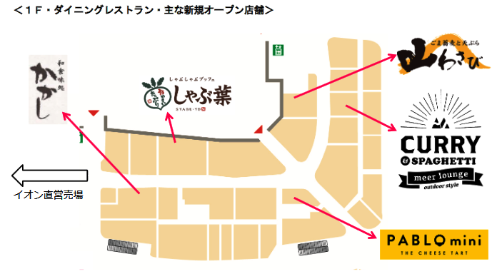 1階ダイニングレストランゾーンでは、北海道発出店のチーズタルト専門店「PABLOmini」、和食の味処「かかし」、同社初出店のドライカレー「カレー&スパゲッティミールラウンジ」、しゃぶしゃぶビュッフェ「しゃぶ葉」、蕎麦ダイニング「山わさび」などがオープン。