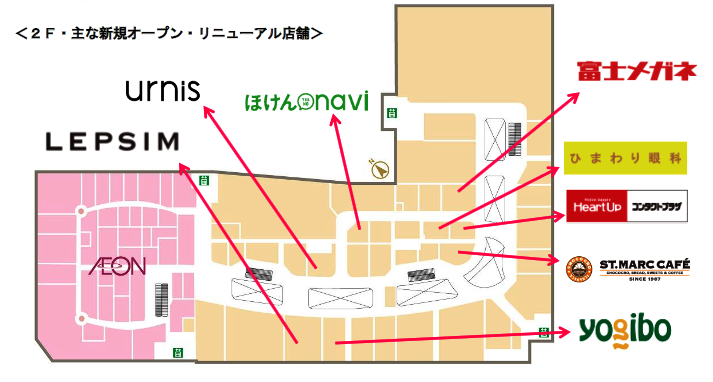 2階のファミリーカジュアルフロアでは、11店舗を移転・リニューアルする。レディスファッションの「LEPSIM」と「urnis」は1階から移設。「サンマルクカフェ」は完全分煙で喫煙席を縮小してリニューアルオープンする。また3階から「ひまわり眼科」を移設して「ハートアップコンタクトプラザ」「富士メガネ」を集結する。さらに米国発の体にフィットするビーズソファ専門店「yogibo」、保険サービス「ほけんnavi」を新たに展開する。