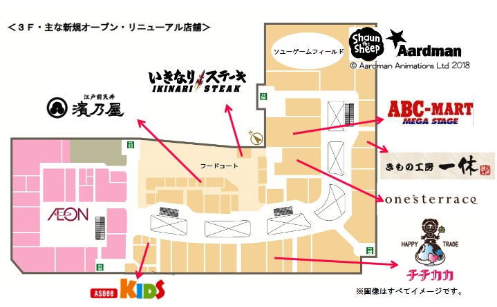 3階は、約810席あるフードコートに、キッズスペースを新たに設置。ベビーカーをそのまま横付けできる席やファミリーでくつろげる「小上がり席」、離乳食利用の子ども優先の「カウンター席」、子どもの遊び場スペースを設置し、ファミリー向けの空間を提供。また、「江戸前天丼濱乃屋」「いきなり!ステーキ」をなど13の飲食店を加える。