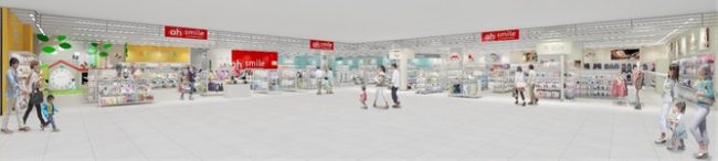 「アカチャンホンポ スマイル」は、出産・子育てのシーンに特化した『ライフスタイル・ショップ』で編成するコンセプトショップだ。2017年6月開店したリバーウォーク北九州店(福岡県北九州市小倉北区)に続く2号目で、関西では初出店となる。「コト発想」で編集されたショップと、体験スペースの「すまいるひろば」で構成されている。