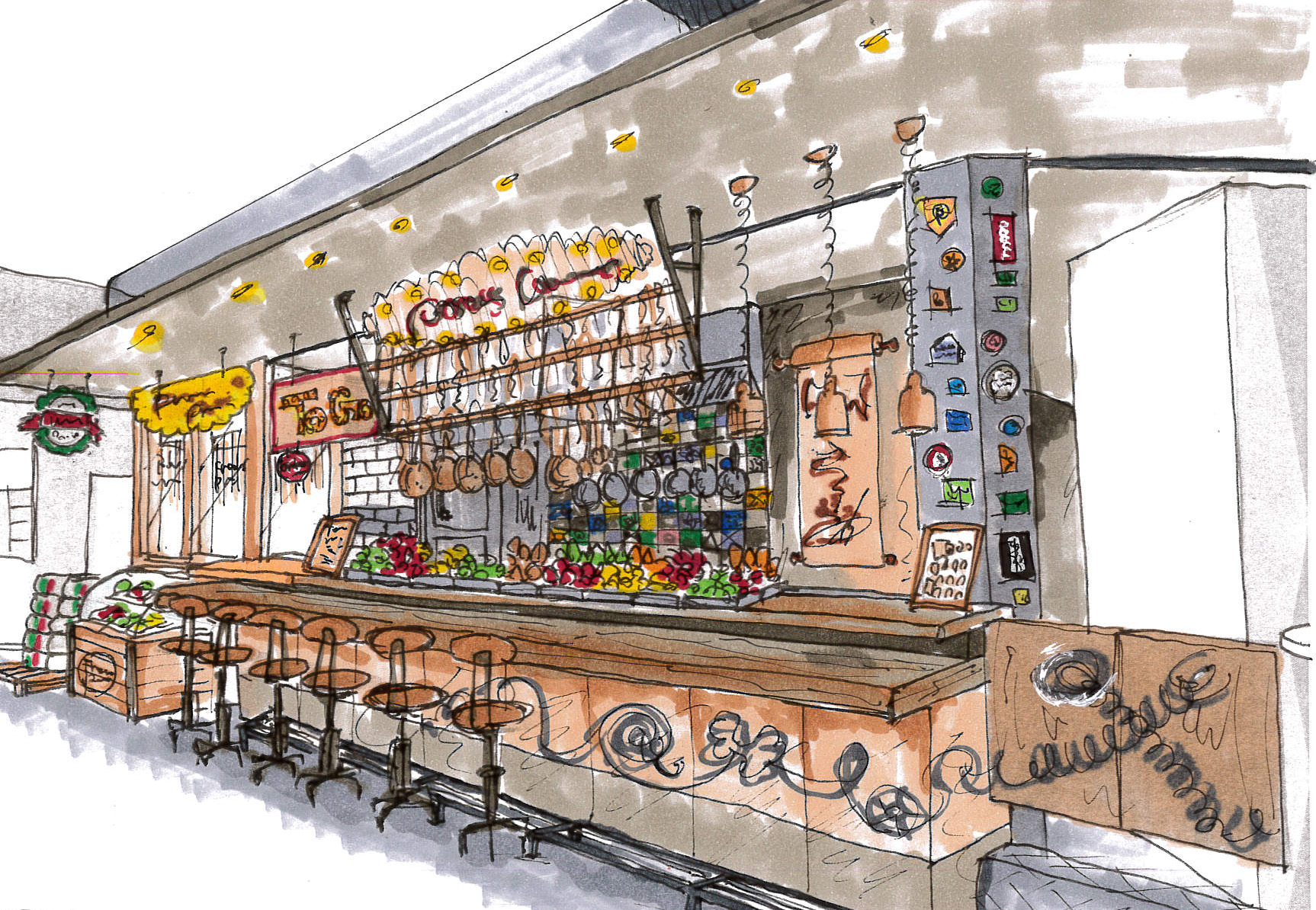 第1は、イタリア食材をメインに異国情緒漂う“イタリアンフードマーケット”を切り口にした「メルカ」エリア。朝はコーヒーとパニーニ、ランチは窯焼きピッツァや自家製生パスタデリ、夜は生ハム&チーズのバルメニューなどを提供する。チョコレートは400種類以上を揃え、イタリアの老舗チョコレートブランド「Venchi(ヴェンキ)」を1粒から量り売りする。チョコレートジェラートや、熱々のチョコレートをその場でかけて仕上げるチョコケーキなど、スイーツも提供する。